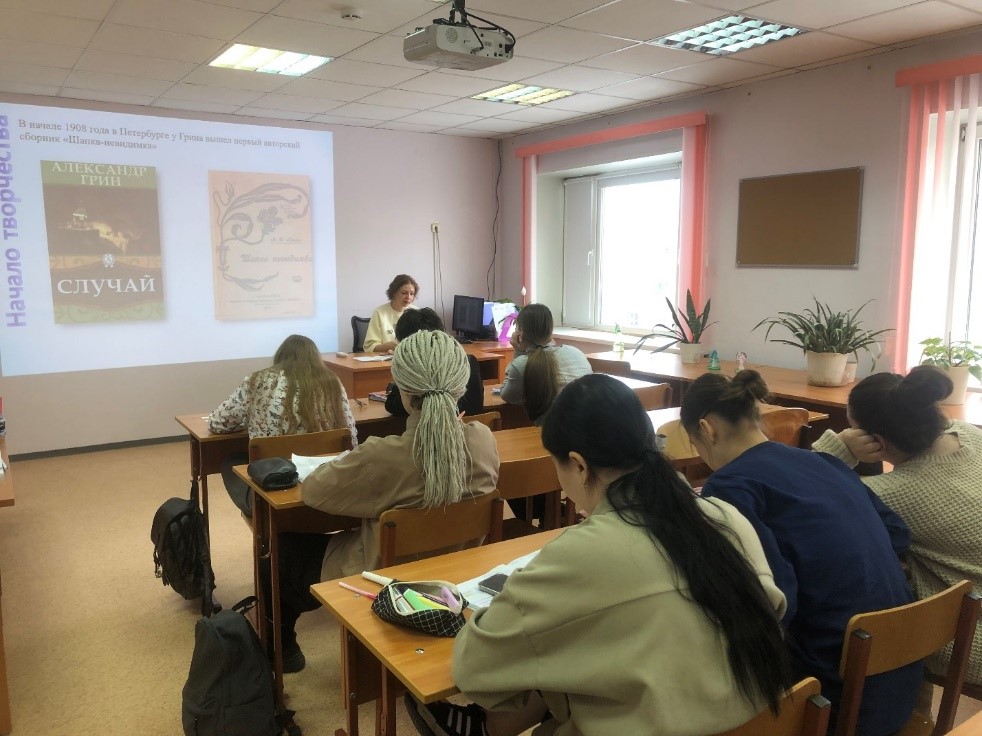 Библиотека отделения Сферы услуг продолжает принимать участие в проекте библиотеки им. Пушкина «Народное чтение». 11.04.2025 г. в группе 212 «Преподавание в начальных классах» прошел литературный час «Рыцарь мечты». На мероприятии говорили о личности и творчестве самобытного романтика, создавшего поэтическую Гринландию, страну мечты и надежды, творчества и красоты Гриневского Александра Степановича, который известен под псевдонимом Александр Грин.