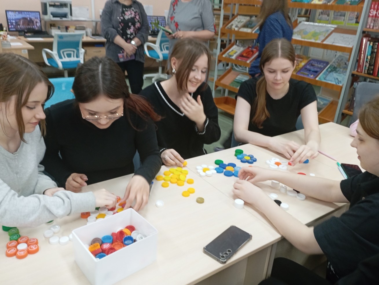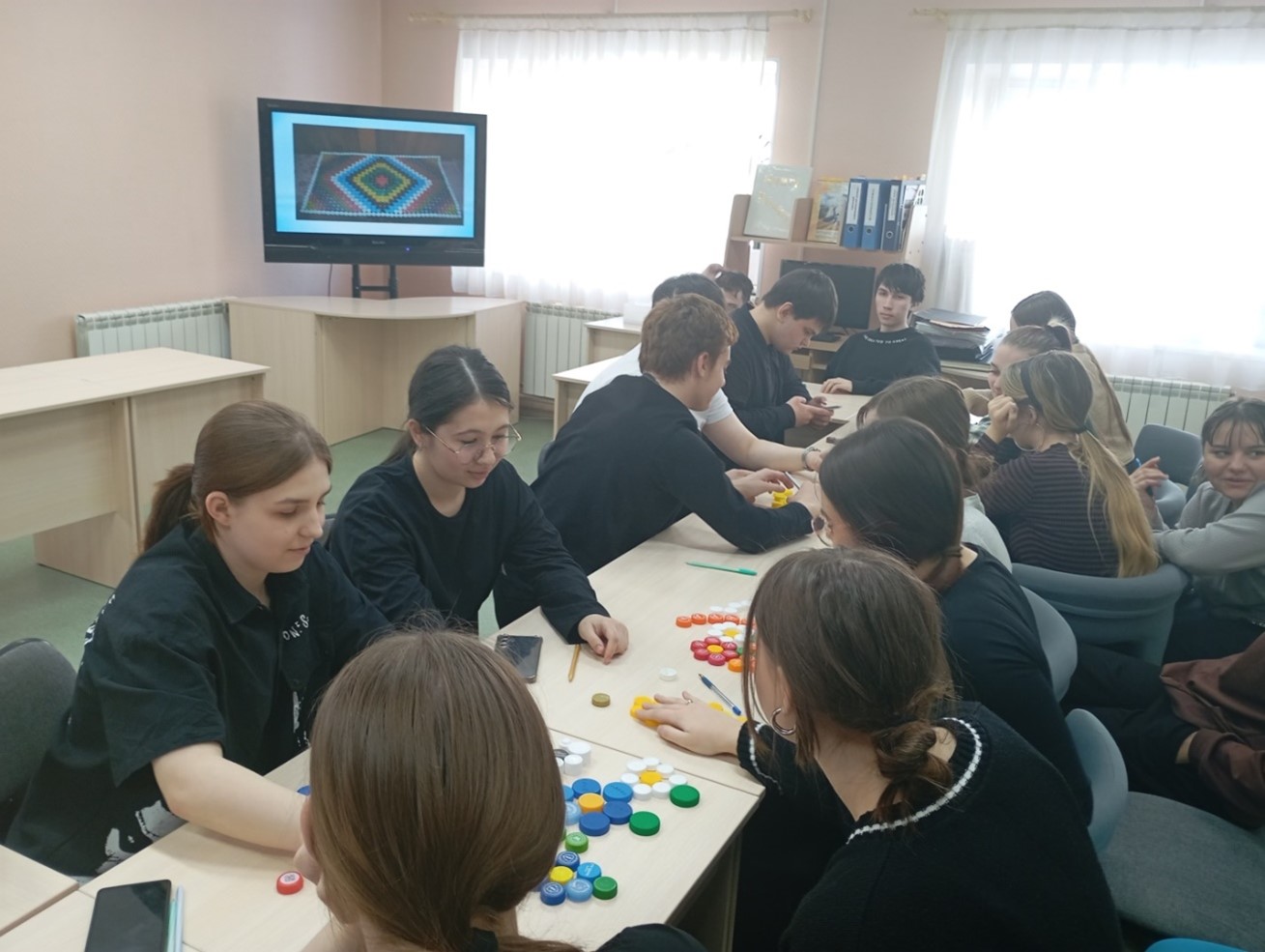 рассуждали об экологических проблемах, об ответственности каждого человека за сохранение окружающей нас среды, развенчивали мифы экологического потребления населением, решали задачи по сбережению природных ресурсов. В заключение урока студенты с удовольствием занялись творчеством, создавая узоры из пластиковых крышечек.