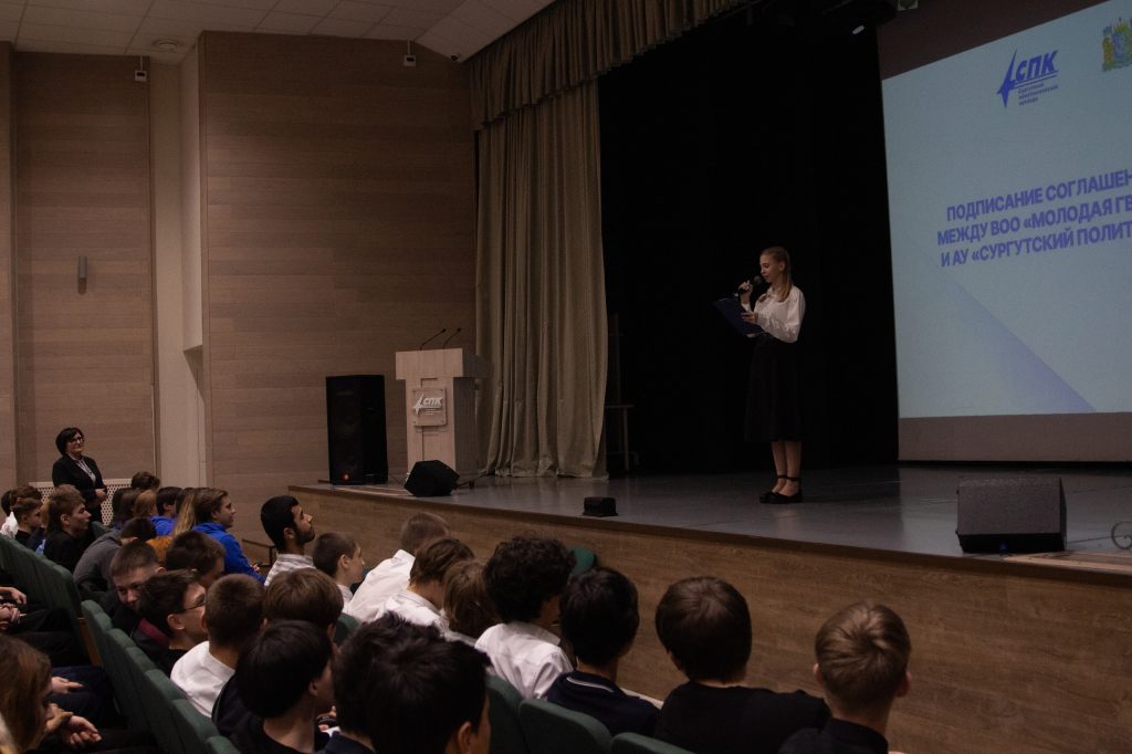 Алена Анатольевна Соловьева и руководитель Ханты-Мансийского регионального отделения Всероссийской общественной организации «Молодая Гвардия Единой России» Даниил Гордеев. Они рассказали студентам о деятельности «молодогвардейцев» и призвали к объединению усилий в реализации образовательных, патриотических, волонтёрских проектов. Соглашение о сотрудничестве предполагает совместную организацию и проведение мероприятий, включая конференции, форумы, круглые столы, флешмобы на территории Сургута.