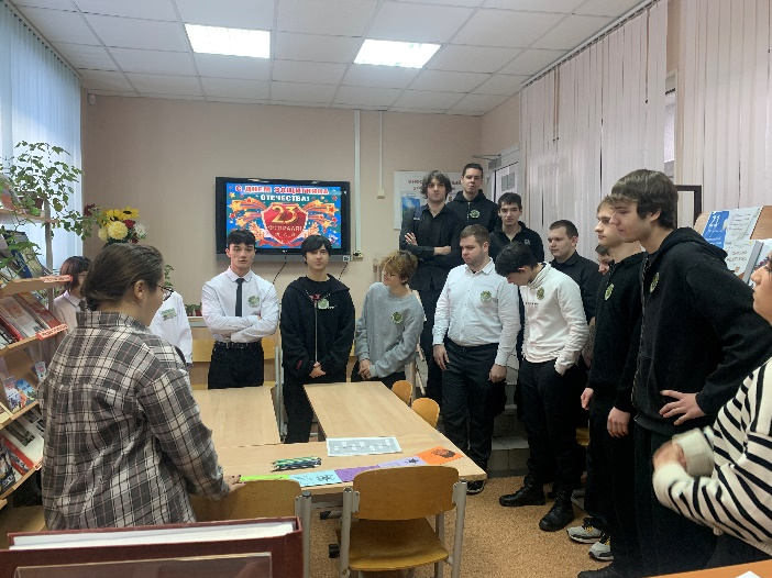 20 февраля в отделении Сферы услуг состоялся квест «Служим Отечеству», посвященный Дню защитника Отечества. В этот день библиотека превратилась в станцию «Интеллектуальная». Команды 6 групп приняли участие в интеллектуальной викторине на военную тематику, направленная на развитие логики, памяти и знаний о видах войск, технике и армейском быте. Привычный формат викторины был дополнен кроссвордом с вопросами на знание исторических событий и терминов. Все команды активно работали продемонстрировали свои отличные знания по теме. Все команды получили по 10 баллов.
