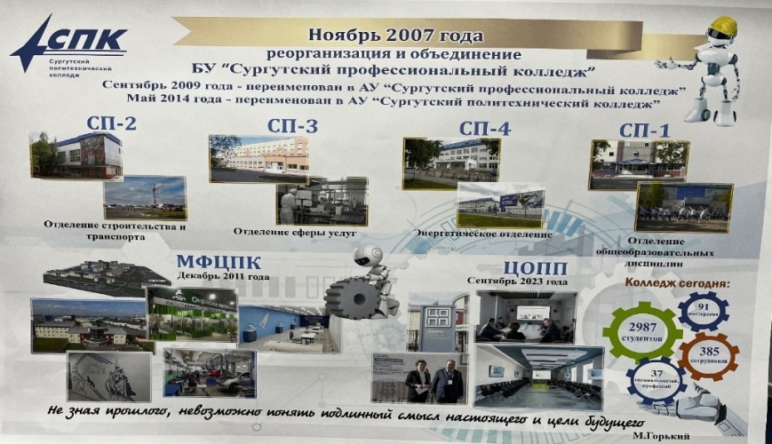 День профессионального образования 22 декабря связан с датой открытия ГПТУ № 17 в 1965 году, которое сейчас является – Отделением строительства и транспорта АУ «Сургутский политехнический колледж». В рамках мероприятий были выпущены Информационные плакаты «История создания АУ «Сургутский политехнический колледж», также в учебном корпусе организована выставка альбомов «Проект создания ресурсного центра, 2011год» и «МФЦПК в лицах 2011-2024».